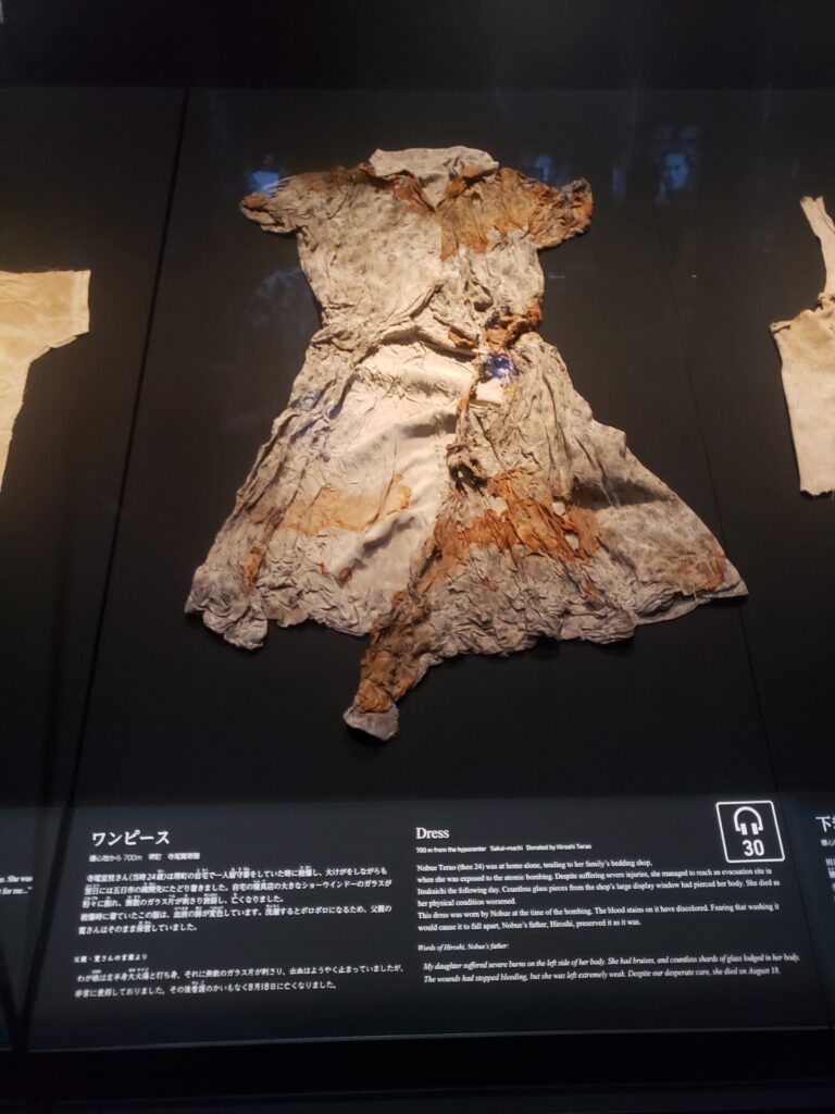 Además de fotografías y relatos, el museo resguarda pertenencias de las víctimas, como el vestido de Nobue Terao, una joven de 24 años que, pese a sobrevivir inicialmente, falleció días después debido a las heridas. Sus prendas, conservadas por su padre, conservan manchas de sangre y fragmentos de vidrio que atravesaron su cuerpo. También se muestran uniformes escolares, relojes calcinados y pertenencias de familias enteras, que evidencian la crudeza de aquel episodio histórico.