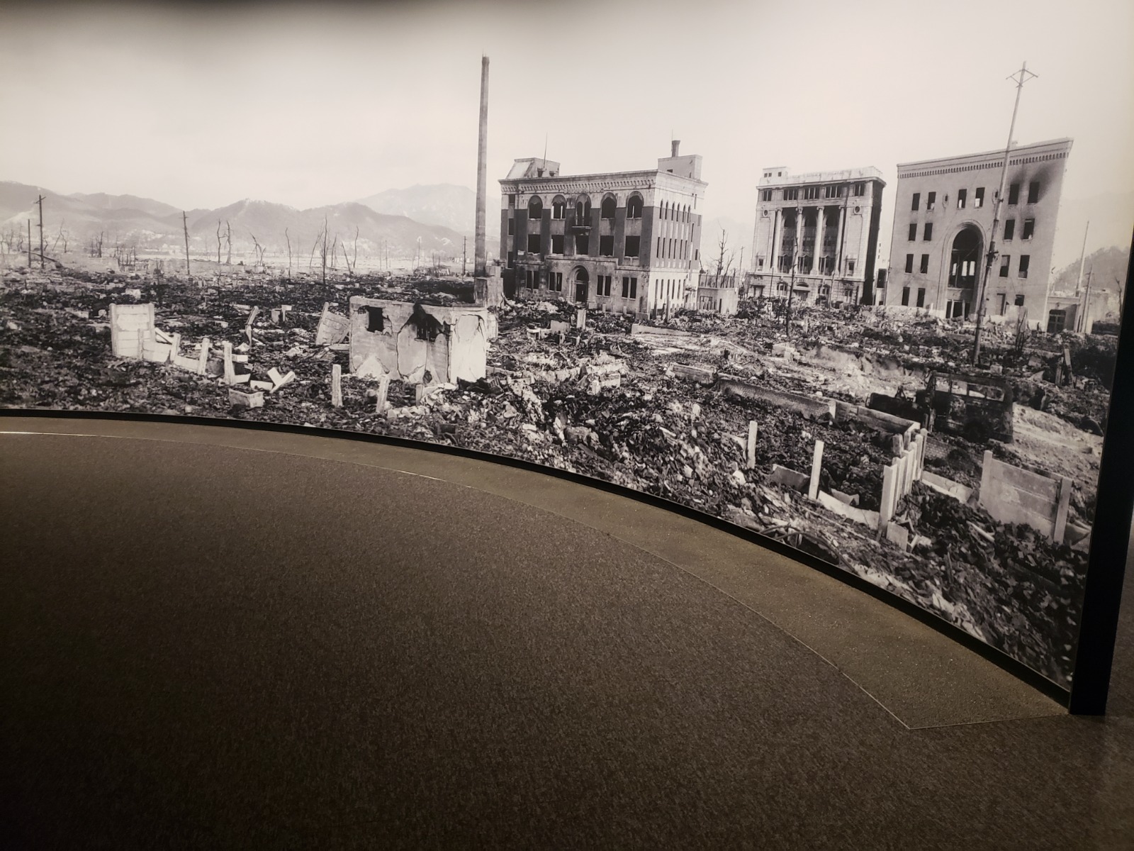 Con un ambiente de iluminación tenue, las salas conducen al visitante hacia los días de horror vividos en Hiroshima y Nagasaki. Las exposiciones incluyen maquetas de la ciudad antes y después de la explosión, paneles que explican el desarrollo de la bomba y sus consecuencias científicas, sociales y políticas, además de testimonios audiovisuales de los supervivientes. En el edificio Este, por ejemplo, una proyección en 3D muestra cómo Hiroshima quedó “convertida en tierra quemada”.