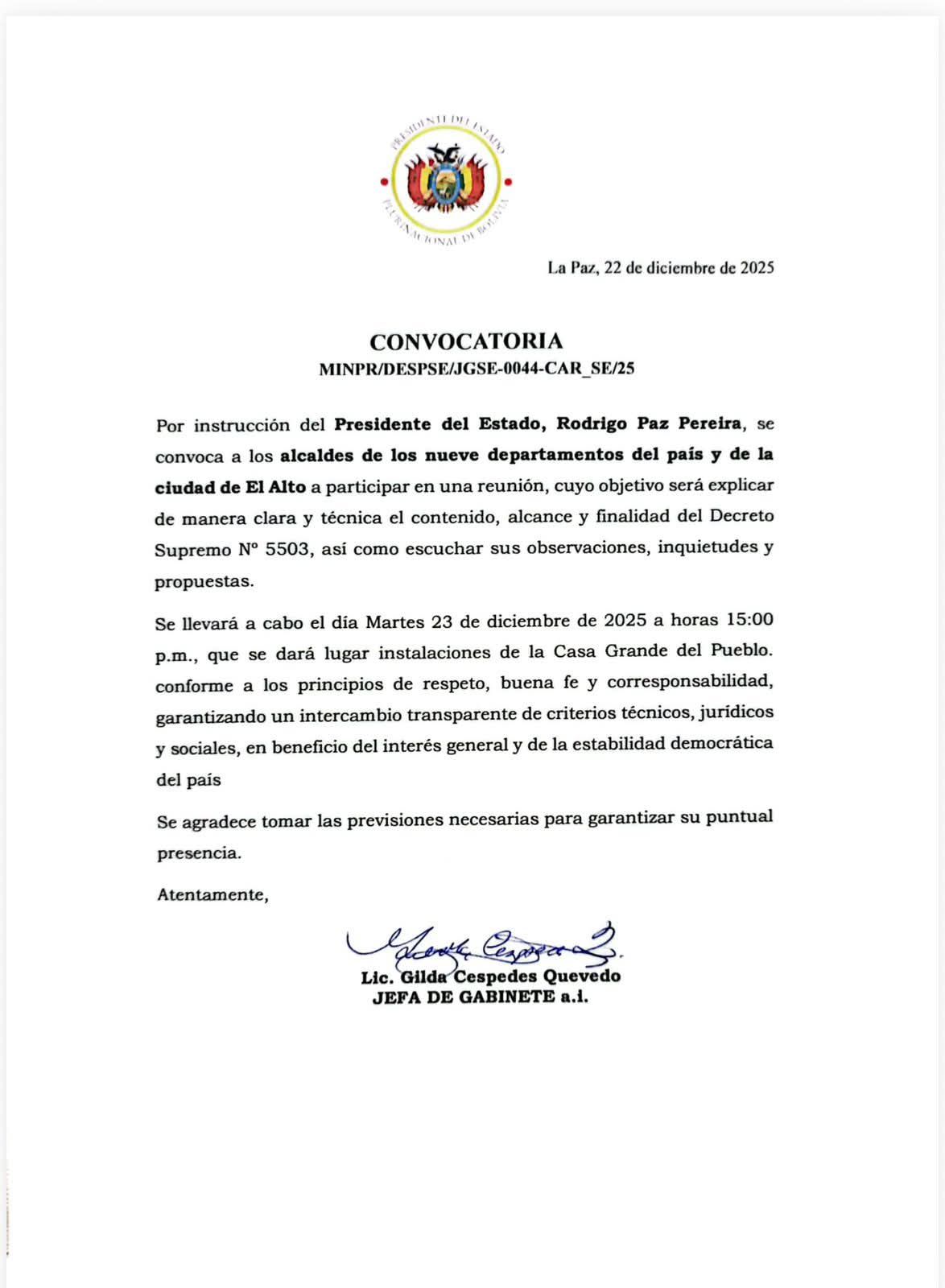 El presidente del Estado, Rodrigo Paz, convocó para este martes 23 de diciembre a las 15:00 en la Casa Grande del Pueblo a los alcaldes de las nueve capitales departamentales y de la ciudad de El Alto, con el propósito de explicar de manera técnica y detallada el Decreto Supremo 5503, norma que ha generado inquietud en distintos sectores sociales y autoridades locales.