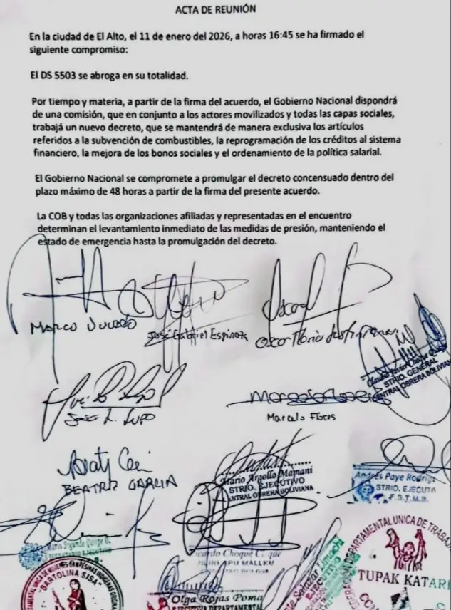Uno de los principales acuerdos es la abrogación total del Decreto Supremo 5503, norma que generó rechazo social y derivó en movilizaciones y medidas de presión a nivel nacional. En su lugar, el Gobierno conformará de manera inmediata una comisión de trabajo, integrada por representantes oficiales y de los sectores movilizados, con el objetivo de elaborar una nueva normativa.