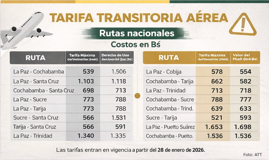 La disposición establece nuevos montos máximos autorizados para los pasajes aéreos dentro del territorio nacional, con ajustes respecto a las tarifas anteriores. Según la ATT, se trata de una medida transitoria que permitirá sostener la operación del mercado aeronáutico y facilitar la ampliación de rutas.