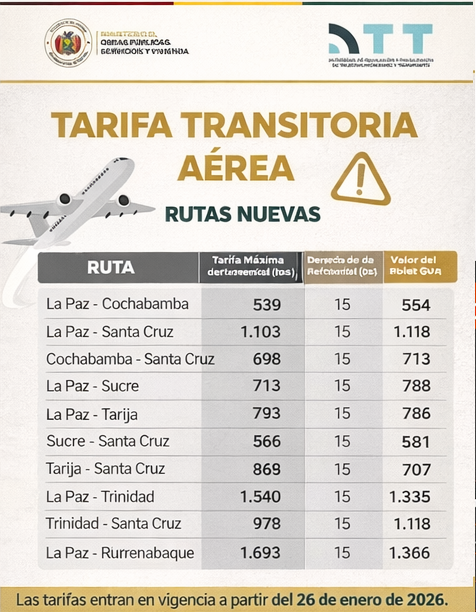 La Autoridad de Regulación y Fiscalización de Telecomunicaciones y Transportes (ATT) aprobó un nuevo tarifario de referencia para vuelos nacionales, que fija precios máximos en 17 rutas aéreas del país, vigente desde este lunes 26 de enero por un periodo de seis meses, con el objetivo de garantizar la regularidad del servicio y ordenar el sistema de tarifas.