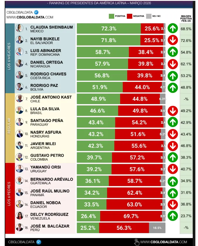 El ranking es encabezado por la presidenta de México, seguida por los mandatarios de El Salvador, República Dominicana, Nicaragua y Costa Rica, quienes también superan el 50% de imagen positiva.