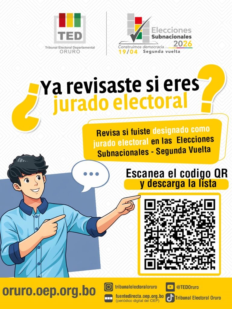 El Órgano Electoral informó que ya está disponible la lista de juradas y jurados de mesa para la segunda vuelta electoral en Oruro, convocando a la ciudadanía a verificar su designación y participar en el proceso.