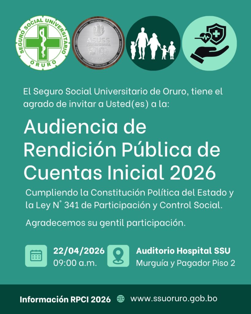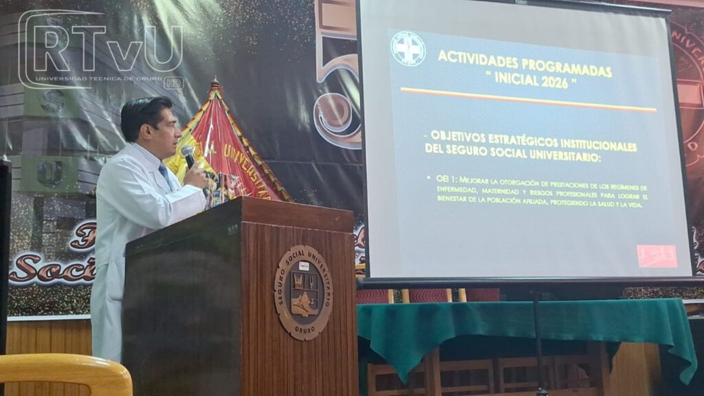 El gerente general del Seguro Social Universitario (SSU), Lic. Manuel Sangueza, presentó la rendición pública de cuentas inicial 2026, donde expuso objetivos estratégicos, desafíos institucionales y el estado financiero de la entidad, en cumplimiento de la Constitución Política del Estado y la Ley 341, en Oruro, este 2026.