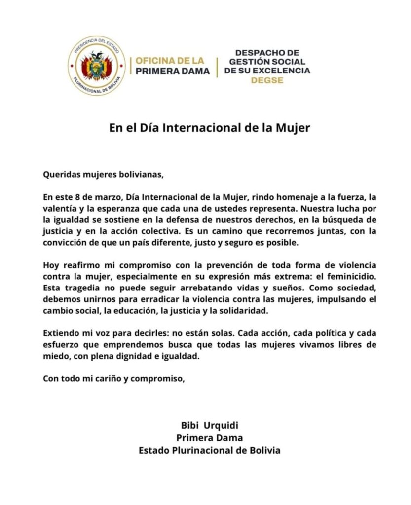 La primera dama de Bolivia, Bibi Urquidi, envió un mensaje a las mujeres del país en el marco del Día Internacional de la Mujer, destacando la importancia del empoderamiento femenino y el apoyo a los emprendimientos liderados por mujeres.